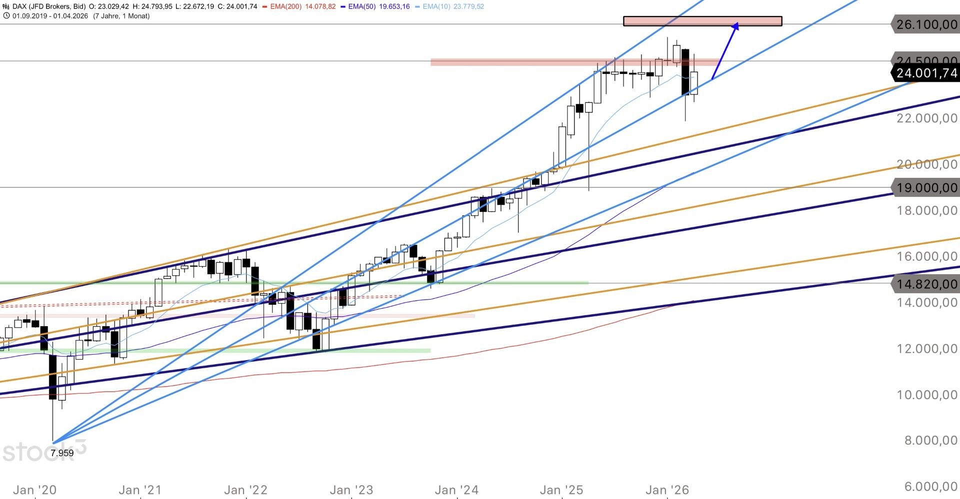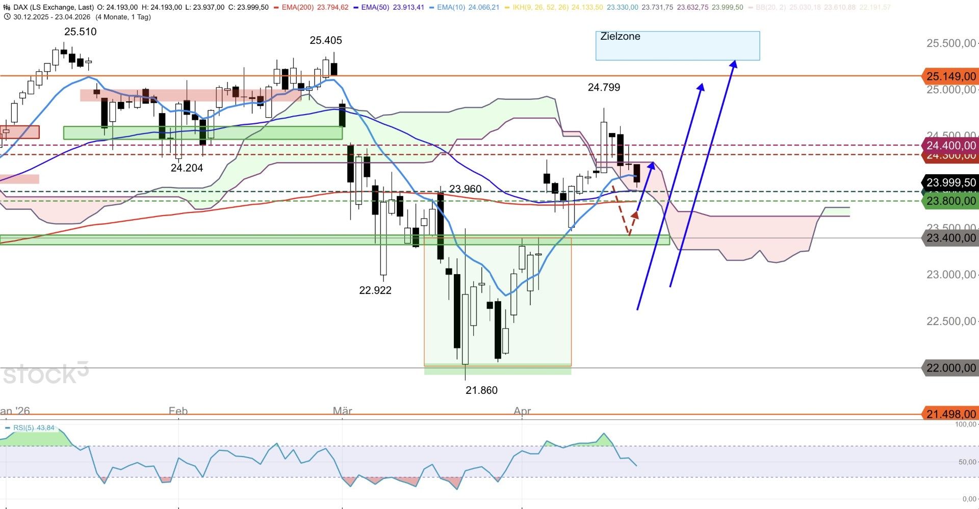 Der DAX schloss am Mittwoch bei 24.193 Punkten (Eröffnung 24.199, Tageshoch 24.389, Tagestief 24.131). Es war der dritte schwache Handelstag in Folge, nachdem der DAX vergangene Woche noch bei 24.799 sein Wochenhoch markiert hatte. Aktuell notiert der DAX vorbörslich auf LS Exchange bei 24.000 Punkten. Der Kurs fällt damit unter den 10er-EMA (24.066) und nähert sich dem 50er-EMA (23.913) sowie dem 200er-EMA (23.794). Der RSI(5) ist auf 43,84 gefallen und signalisiert da-mit nachlassende Dynamik, ohne bereits überverkauft zu sein. Belastend wirkt vor allem das nach-börsliche Ergebnis von Tesla. Die Aktie gab nach den Quartalszahlen nach. Tesla lieferte zwar 6 % mehr Fahrzeuge als im Vorjahr, blieb aber hinter der Markterwartung beim Umsatzwachstum zurück. An den Rohstoffmärkten steigt der Ölpreis wieder. WTI legt 1,02 % auf 93,91 Dollar zu, Brent steigt 0,96 % auf 102,89 Dollar. Damit notiert Brent erneut über der 100-Dollar-Marke. Die Verlängerung des Waffenstillstands hat den Ölpreis nur kurzzeitig gedrückt, die strukturelle Angebotsunsicherheit durch die Hormus-Problematik bleibt bestehen. Gold gibt 0,48 % auf 4.730 Dollar ab, Silber fällt 2,26 % auf 76,19 Dollar. Die 10-jährige US-Rendite steht bei 4,288 %. Die Saisonalität spricht im DAX (Daten der vergangenen 10 Jahre) von Mitte April bis Anfang Juni für eher weiter steigende Kurse.