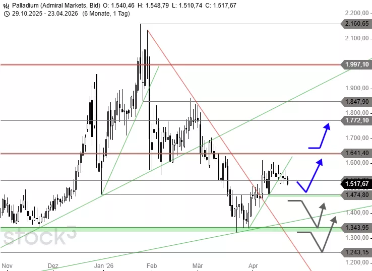 Der Abwärtstrend seit Januar ist weiterhin intakt, und die Rücksetzer der letzten Tage legen nahe, dass es in Kürze noch eine Zwischenkorrektur in Richtung 1.474 USD geben kann. Dennoch hat die Erholung seit Ende März weiterhin das Potenzial, den Abverkauf zu beenden und mit einem Anstieg über die 1.641-USD-Marke ein Kaufsignal zu generieren. In der Folge dürfte der Palladiumpreis bis an die mittelfristige Hürde bei 1.772 USD steigen. Abgaben unter 1.474 USD müssten dagegen bei 1.423 USD aufgefangen werden, um einen erneuten Test des Supports bei 1.343 USD zu verhindern.
