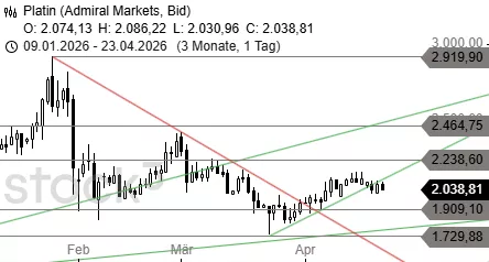 Platin tendiert weiter über der Unterstützung bei 1.998 USD seitwärts und dürfte diese Stabilität in Kürze für einen Ausbruchsversuch über 2.157 USD nutzen. Abgaben unter 1.909 USD würden dagegen ein Verkaufssignal auslösen.