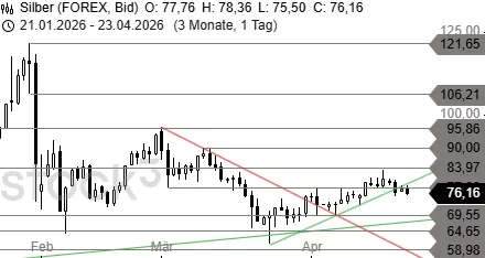 Mit dem Rücksetzer unter den Support bei 77,88 USD hat sich bei Silber eine Korrektur fortgesetzt, die jetzt auf die Unterstützungszone bei 74,30 USD bis 75,00 USD zusteuert. An dieser Stelle gäbe es die Chance auf eine Erholung, die allerdings erst über 79,00 USD zu einem Kaufsignal führen würde.