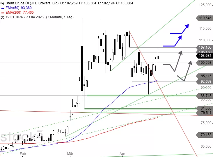 Der Ölpreis (Brent) setzte gestern den erwarteten Anstieg dynamisch fort und überwand die breite Widerstandszone um 101,10 USD. Dieses kurzfristige Kaufsignal setzte neue Kräfte frei und sorgte für einen Angriff auf die Kurshürde bei 105,15 USD. Diese wurde bereits leicht überschritten und damit der Kursrückgang seit dem Hoch vom 07. April neutralisiert. Nach einem Hoch bei 106,56 USD gönnte sich die starke Aufwärtswelle eine Pause. Seit dem frühen Morgen zieht der Ölpreis jedoch schon wieder an.