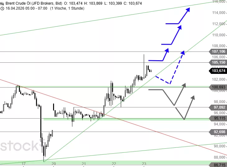 Die bei 87,28 USD begonnene Aufwärtstrendphase erreicht jetzt ein wichtiges Ziel- und Widerstandsgebiet: Ein Anstieg über 105,15 USD würde für die Fortsetzung der Kaufwelle bis zur Hürde bei 107,10 USD und dem Kursziel bei 108,00 USD sprechen. Darüber sollte sich der Anstieg nochmals beschleunigen und bis ca. 111,00 USD führen. Oberhalb von 111,80 USD dürfte bereits das Hoch vom 07. April bei 114,21 USD überschritten und die 116,00-USD-Marke erreicht werden. Erst Kurse unterhalb von 100,69 USD würden diesen Anstieg aktuell verhindern und zu einer Korrektur bis 97,77 USD und 97,00 USD führen.