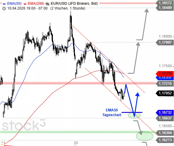 Die Abwärtskorrektur seit dem Aprilhoch scheint sich auszuweiten, EUR/USD weiter abwärts in Richtung EMA50 im Tageschart tendieren. Vom Support bei 1,1664 - 1,16732 USD aus bestehen dann gute Chancen auf eine technische Erholung und sogar den Start einer größeren Aufwärtsbewegung. Wird auch dieser Unterstützungsbereich signifikant unterboten, liegt bei 1,1627 - 1,1640 USD die nächste Auffangzone. Auf der Oberseite genügt nicht nur eine Rückkehr über 1,1722 USD für Kaufsignale, EUR/USD müsste nachhaltig über 1,1737 USD ausbrechen. Dann kommen die Aprilhochs wieder auf den Schirm.