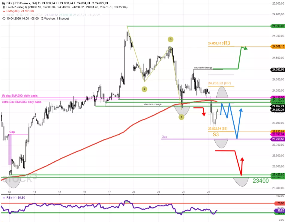Heute früh in der Vorbörse wird der DAX nicht mehr über der Unterstützungszone 24.165/24.115 getaktet, sondern bei ca. 24.020 (SAP veröffentlichte vorbörslich Zahlen). Eine DAX-Eröffnung unter 24.100 alarmiert, denn sie macht den DAX labil. 1) Der DAX läuft unter 24.115/24.165 Gefahr, bis 23.775/23.750 (EM200/Gap) zu fallen. 2) DAX-Widerstand des Tages ist demnach der Bereich 24.115/24.165. DAX-Unterstützungsbereich ist 23.775/23.750. 3) Steigt der DAX per Stundenschlusskurs über 24.400, ist der Abwärtstrend der letzten drei Tage beendet. Die Folge wäre eine DAX-Anstiegschance zu 24.600. 4) Fällt der DAX auch unter 23.750, dann ist 23.480/23.425/23.400 die nächste untere Zielzone.