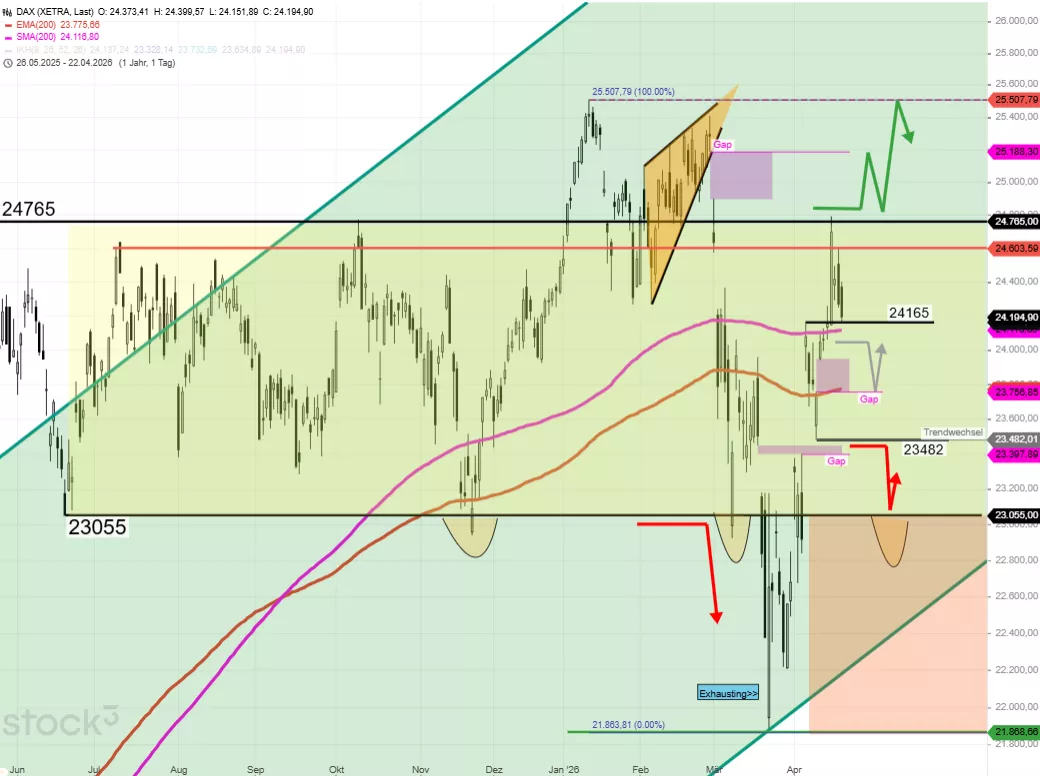 Der Chart gibt Hinweise auf einen möglichen Bruch, der aber bis Ende April bestätigt werden sollte. Bleiben wir länger unter 24.000 wäre das bärische Szenario wieder im Spiel. Ansonsten weiterhin Entscheidungsfindung zwischen 23.900 - 24.400 möglich.