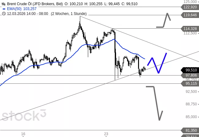 Trotz des Rücksetzers bleibt stärkerer Verkaufsdruck bislang aus. Ausgehend von der Unterstützung bei 97,80 USD besteht weiterhin die Möglichkeit einer erneuten Aufwärtsbewegung. Spielraum ergibt sich dabei bis zum Abwärtstrend der Vortage im Bereich von 108,70 USD. Sollte Brent jedoch deutlicher unter den Aufwärtstrend und unter 95,12 USD fallen, könnte sich die Korrektur ausweiten und Abgaben bis in den Bereich von 85,00 USD nach sich ziehen.