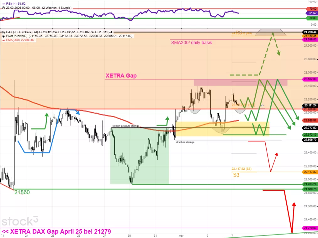 Der Rebound ist nicht stark, hat Züge einer bärischen Flagge. 1) Der DAX bleibt unter 23.957 im Abwärtstrend. Diesen Status heute zu ändern wird sehr schwer. 2) Der DAX ist oberhalb von 22.209 in der Lage, seinen Rebound noch nach oben auszubauen, zum Beispiel bis zum Gap fill 23.502. 3) BÄRISCH: Unter 22.209 ginge es mit dem DAX diese Woche schnell abwärts zu mindestens 21.850 und oft auch zu 21.279 (Gap und 4-jähriger Aufwärtstrend). 4) BULLISCH wäre nur der Tagesschluss über 23.957/24.100/24.325, ein weiter Weg. Das kann hier momentan nicht meine erste Wahl sein. 5) DAX Intraday-Unterstützungen sind heute 23.072/23.058, 22.890 & 22.672. 6) DAX-Intraday -Widerstände stellen heute 23.400/23.500, 23.743 sowie 24.100 dar.