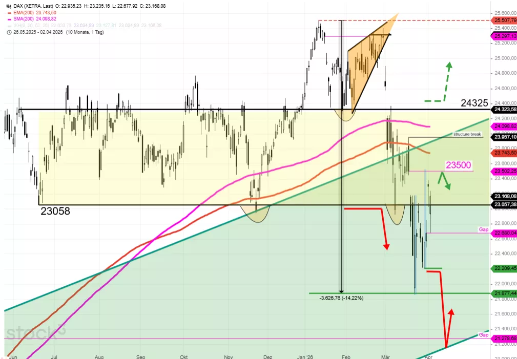 Der DAX hatte vom Jahreshoch 14 % abgegeben, dabei die große Nackenlinie 23.058-x aktiviert, die beiden 200 Tage-Linien (bei 23.743 und 24.099) unterschritten. Nach -14 % vom Top setzte ein Rebound (Zwischenanstieg aufgrund von Window Dressing zum Quartalsschluss) ein, der bisher keine ausreichende Durchschlagskraft zeigt! Neue Jahreshochs erscheinen dabei in diesen Tagen kaum.