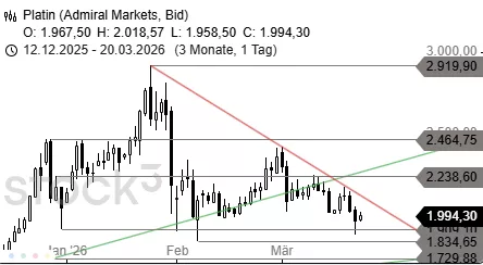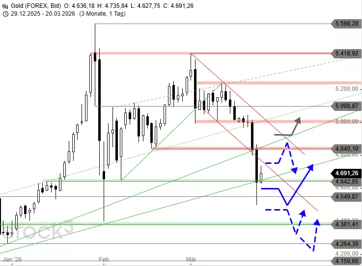 Der crashartige Einbruch könnte vorerst erfolgreich gestoppt worden sein. Auf Basis der Verkaufswelle aus dem Januar und dem Einbruch von 5.418 USD bis 4.991 USD Anfang März lag bei 4.503 USD ein wichtiges Abwärtsziel. Die Marke dürfte zwar bei erneuten Abgaben unter 4.642 USD und 4.590 USD wieder erreicht werden, dort dürfte aber ein Doppelboden entstehen. Dies würde auch Verluste bis 4.381 USD und 4.330 USD verhindern. Ein Sprung über 4.740 USD könnte dagegen die Erholung bis 4.810 USD und 4.840 USD ausweiten. Darüber könnte die Abwärtstrendlinie bei 4.890 USD erreicht werden.