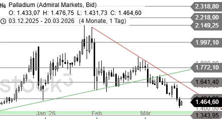 Palladium steuert nach dem gestrigen Abverkauf unter 1.494 USD weiter auf den Support bei 1.343 USD zu. Dort könnte eine stärkere Erholung folgen. Mit einem Anstieg über 1.494 USD dürften sich die Bullen ebenfalls zurückmelden.
