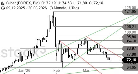 Im gestrigen Handel setzte sich die am Widerstand bei 5.420 USD Anfang März gestartete Verkaufswelle mit brachialer Wucht fort und ließ den Goldpreis unter den wichtigen Support bei 4.840 USD und die weit darunter liegende Kreuzunterstützung bei 4.642 USD einbrechen. Erst auf Höhe von 4.500 USD kam der Kurssturz zum Stehen und wurde von einer Erholung abgelöst. Die übergeordneten Verkaufssignale, die der gewaltige Einbruch mit sich brachte, wurden durch den Anstieg aber nicht gekontert. Ein Lichtblick ist jedoch, dass zumindest die mittelfristige Aufwärtstrendlinie zurückerobert wurde.