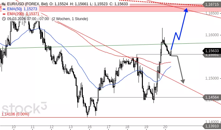 Der gestrige Aufwärtsschub verschafft EUR/USD kurzfristig weiteres Potenzial bis ca. 1,1660 USD. Dort warten mehrere Widerstände, die sich zu einer sehr dicken Widerstandszone verbinden. Diese dürfte nur schwer zu überwinden sein. Sollte EUR/USD aber wieder unter 1,1555 USD abfallen, müsste mit Abgaben gen 1,1499 USD, also bis an den gebrochenen Abwärtstrend ab 27. Februar gerechnet werden.