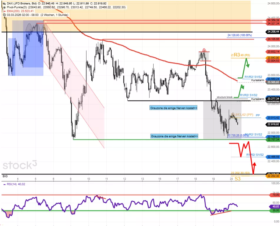 Heute ist großer dreifacher Derivateverfallstermin. Der DAX wurde im Vorfeld zur passenden Marke geführt (Di bis Do). Die Bewegungsamplituden sind da heute eher begrenzt, vor allem bis 13 Uhr (FDAX-Verfall). Der DAX ist heute zwischen 22.737/22.700 und 23.250/23.277 neutral. Der DAX bricht unter 22.700 stark ein bis zu 21.279/21.216 (Gap & Wochen-Pivot S3). Zwischenziele wären heute 22.500 (Gap) und 22.222/22.200. Der DAX stellt eine Verbesserung des Chartbilds wie folgt her: Schritt 1: Stundenschluss über 23.280. Schritt 2: Tagesschlusskurs über 23.957.