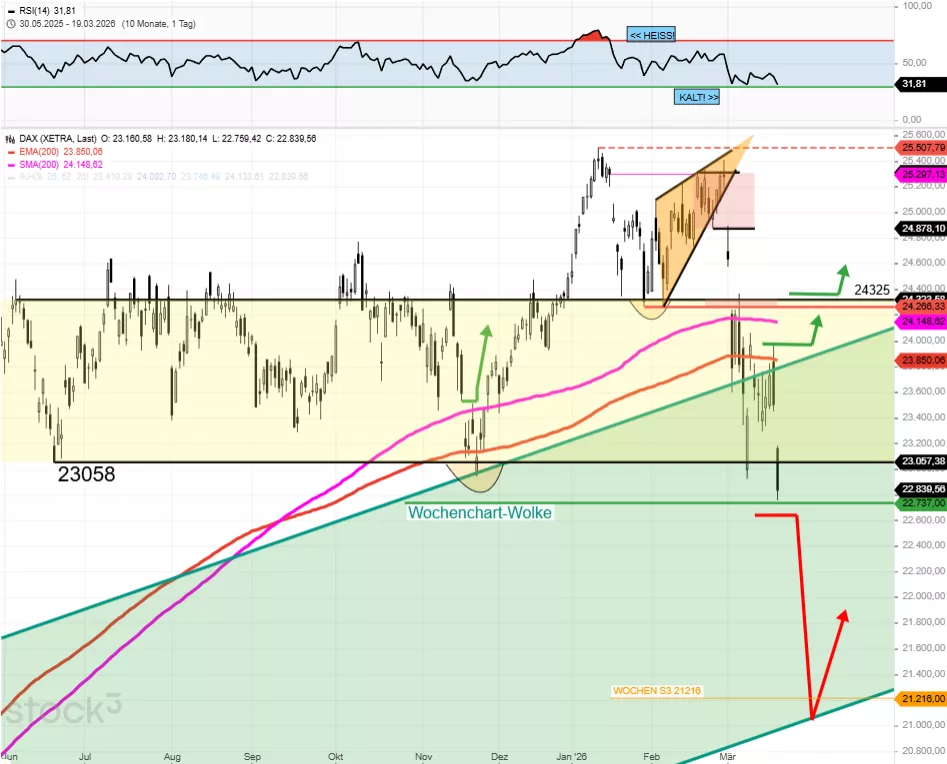 Der DAX zeigt sich am heutigen Großen Verfallstermin im frühen vorbörslichen Handel im Bereich von 23.040 Punkten, nachdem er am Vortag mit einer bullischen Tageskerze mit einem langen unteren Schatten und einem kleinen Kerzenkörper bei 23.009 Punkten aus dem Handel gegangen war. Der Leitindex sollte wahrscheinlich kurz vor dem endgültigen Verlaufstief der langen Korrektur stehen und dann in der Folge eine neue Aufwärtsbewegung einleiten. Daher sollte aktuell verstärkt auf Long-Signale geachtet werden. Der heutige Handel wird vollständig vom großen Verfallstag (Hexensabbat / Triple Witching) dominiert. Optionen und Futures auf Indizes und Einzelaktien verfallen gleichzeitig, dies geschieht jeweils am dritten Freitag des letzten Monats eines Quartals. Das Handelsvolumen dürfte deutlich über dem Durchschnitt liegen, wobei die Abrechnung der DAX-Optionen um 13:00 Uhr und der Futures gegen Börsenschluss stattfindet. Nach dem Verfall zeigt sich erfahrungsgemäß die „wahre" Marktrichtung für die kommenden Tage. Zudem ist heute Frühlings-Tagundnachtgleiche (Frühlingsäquinoktium), in Japan ein Feiertag, was die asiatische Liquidität einschränkt. Vielleicht be-ginnt ja nach dem Winter nun auch der Frühling an den Finanzmärkten.