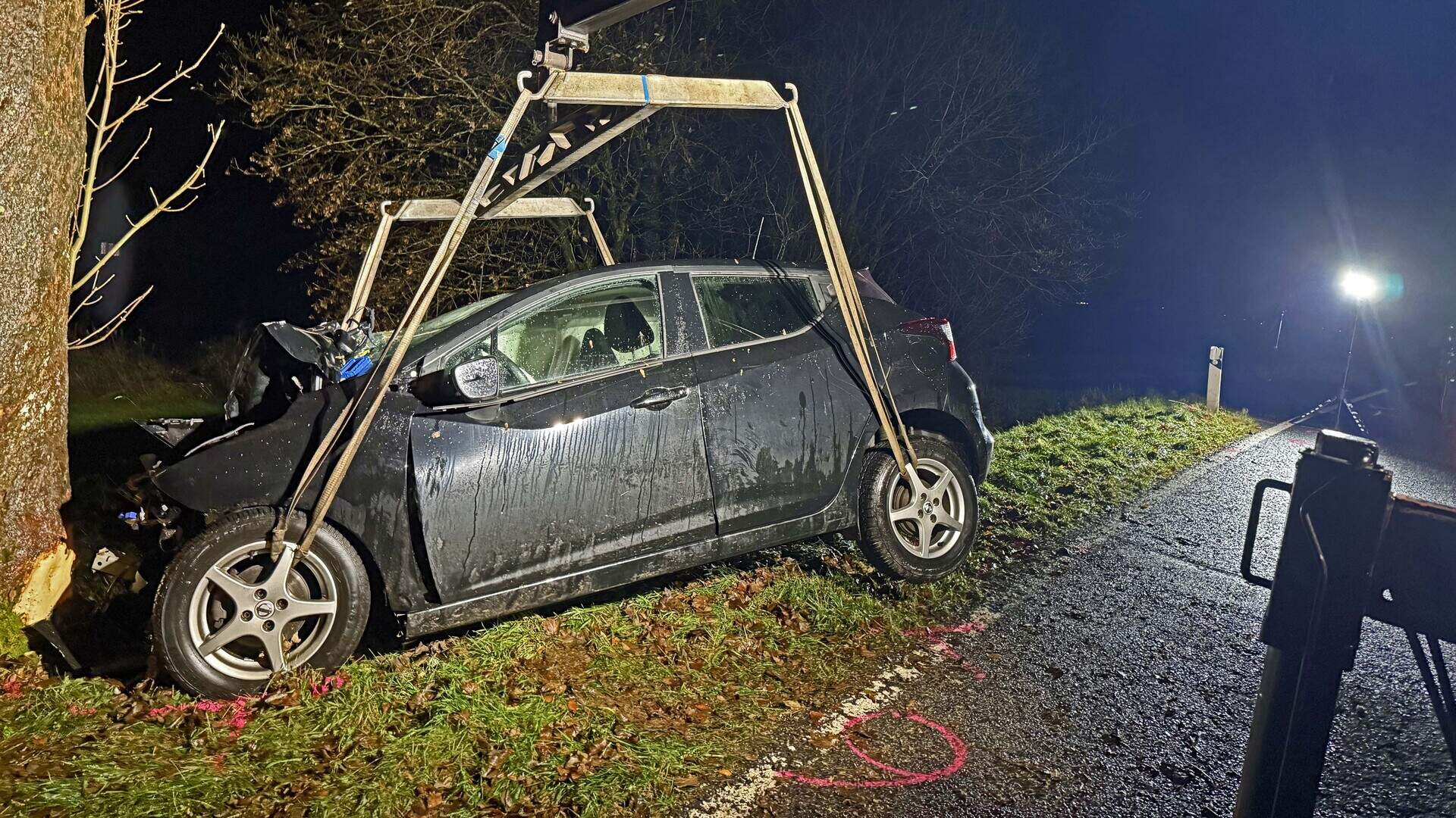 In einer Linkskurve kam das Auto aus bisher ungeklärter Ursache von der Fahrbahn ab und prallte frontal gegen einen Baum